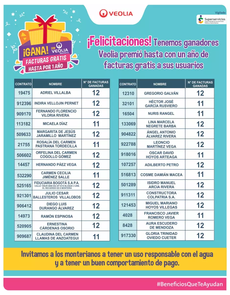 Algunos de nuestros ganadores como Silvia del Carmen Vargas Domínguez, residente en la Urbanización Santa Elena IV dijo que no se esperaba esto y agradeció a Veolia por este premio en estos momentos difíciles. Por su parte, Yamit Ortega Márquez, habitante de la Urbanización Mi Refugio expresó que Veolia le llevó una buena noticia y que Dios los siga iluminando para seguir trabajando por Montería.