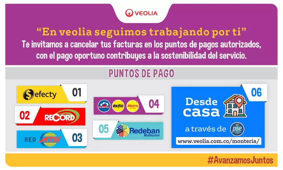 En Veolia Aguas de Montería sabemos que unidos podemos superar grandes retos, por eso en medio de esta emergencia sanitaria, la compañía quiere transmitir reconocimiento al esfuerzo y compromiso de nuestros usuarios por el pago oportuno de sus facturas.