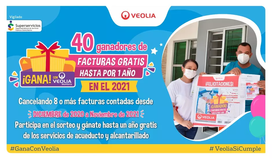 En Veolia Aguas de Montería somos conscientes de que este año también tendremos grandes retos que superar en esta emergencia sanitaria, por ello queremos seguir reconociendo el compromiso de nuestros usuarios por el pago de sus facturas. En este 2021 seguimos con nuestra campaña GANA HASTA UN AÑO DE FACTURAS GRATIS CON VEOLIA.